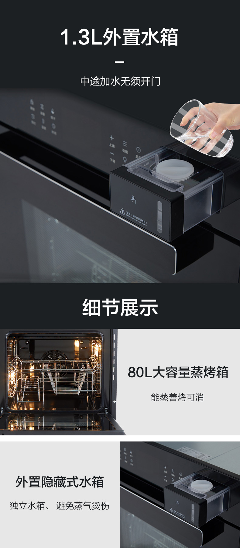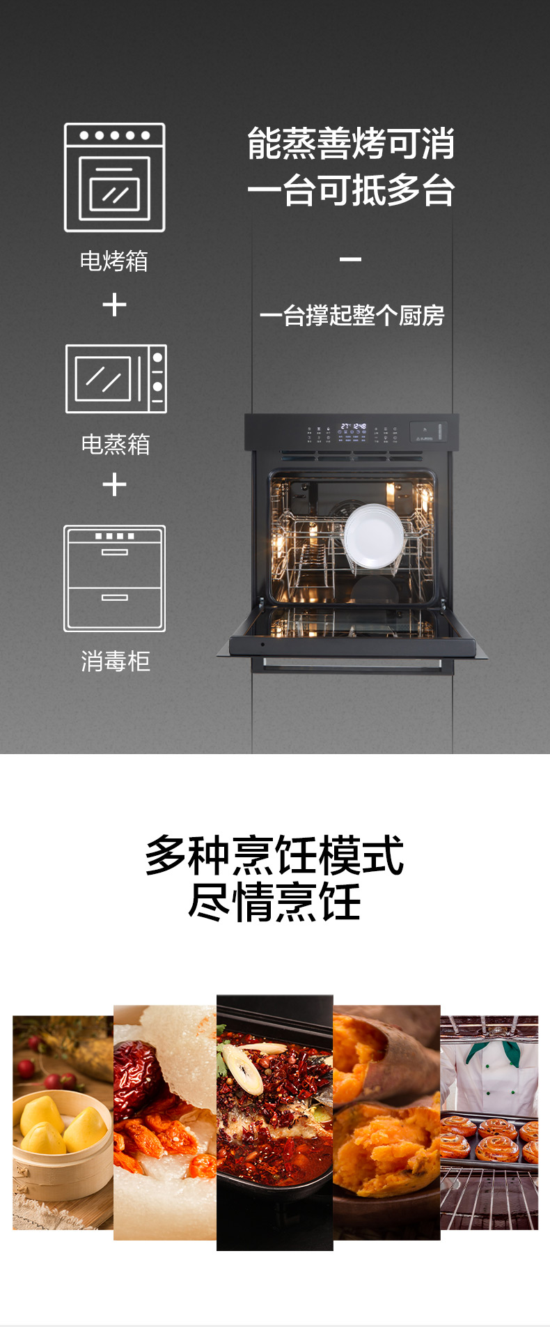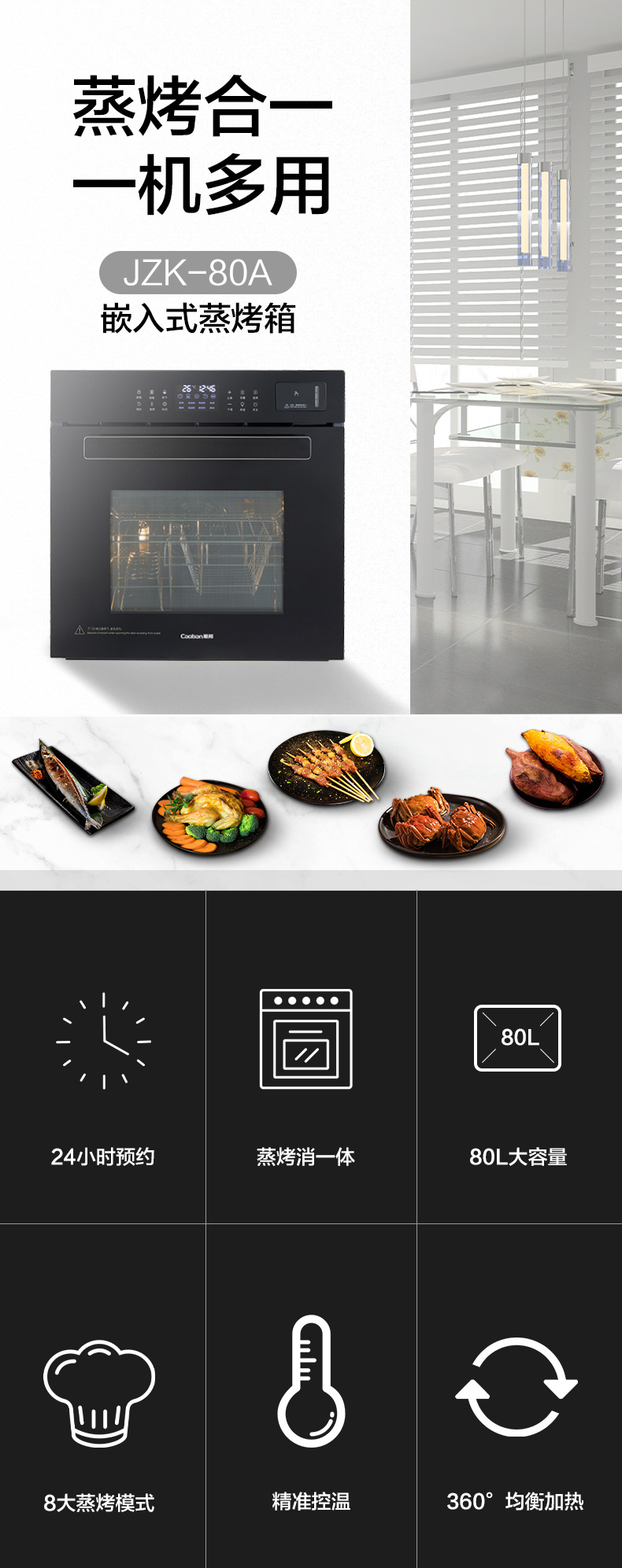 蒸烤消一體;360°均衡加熱,精準(zhǔn)控溫;80L大容量;