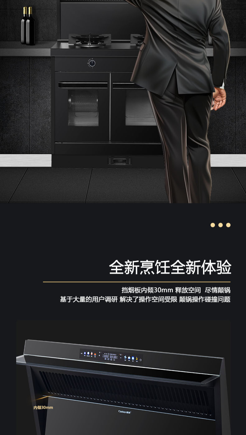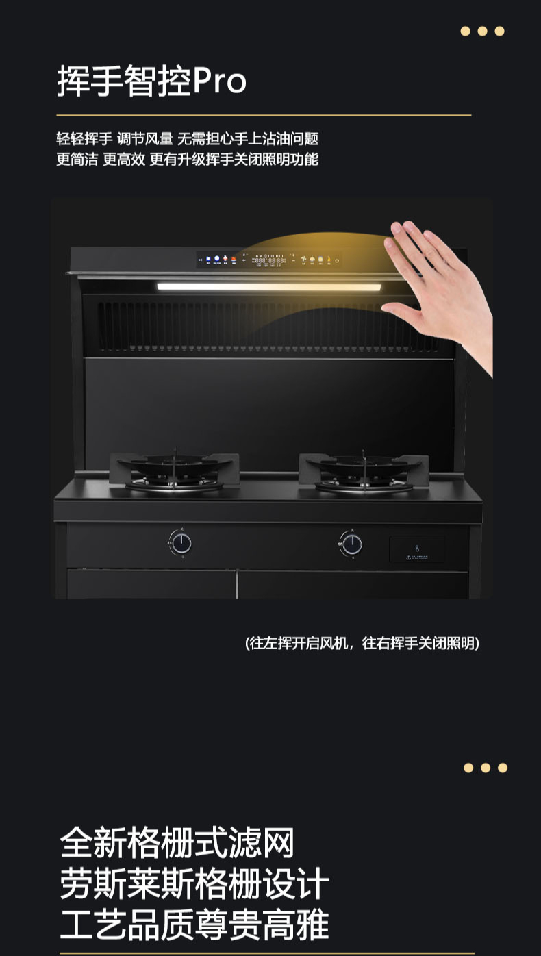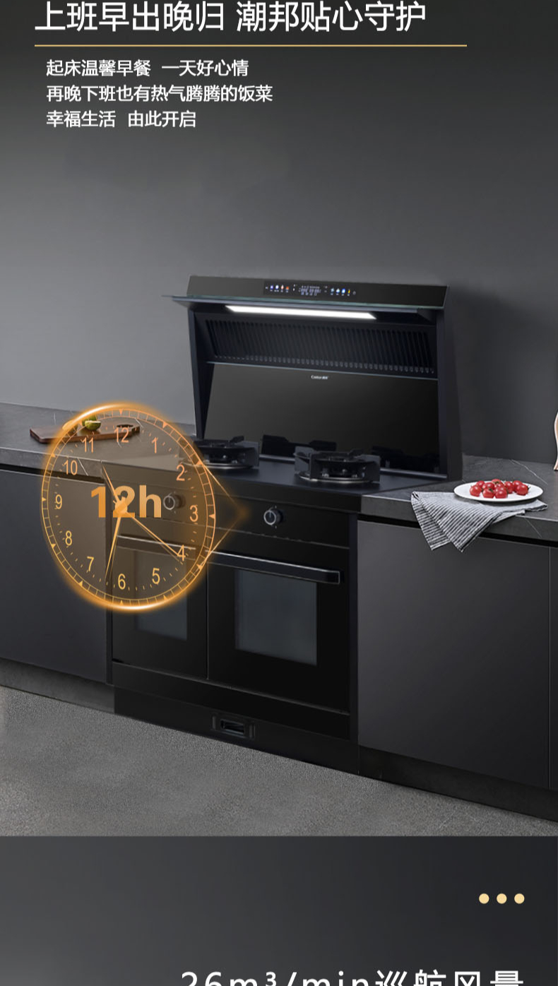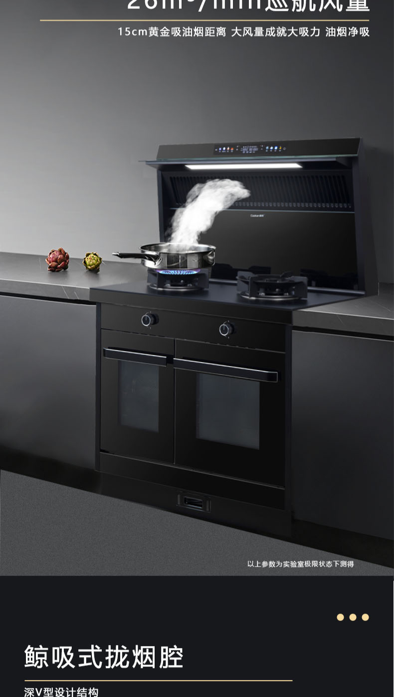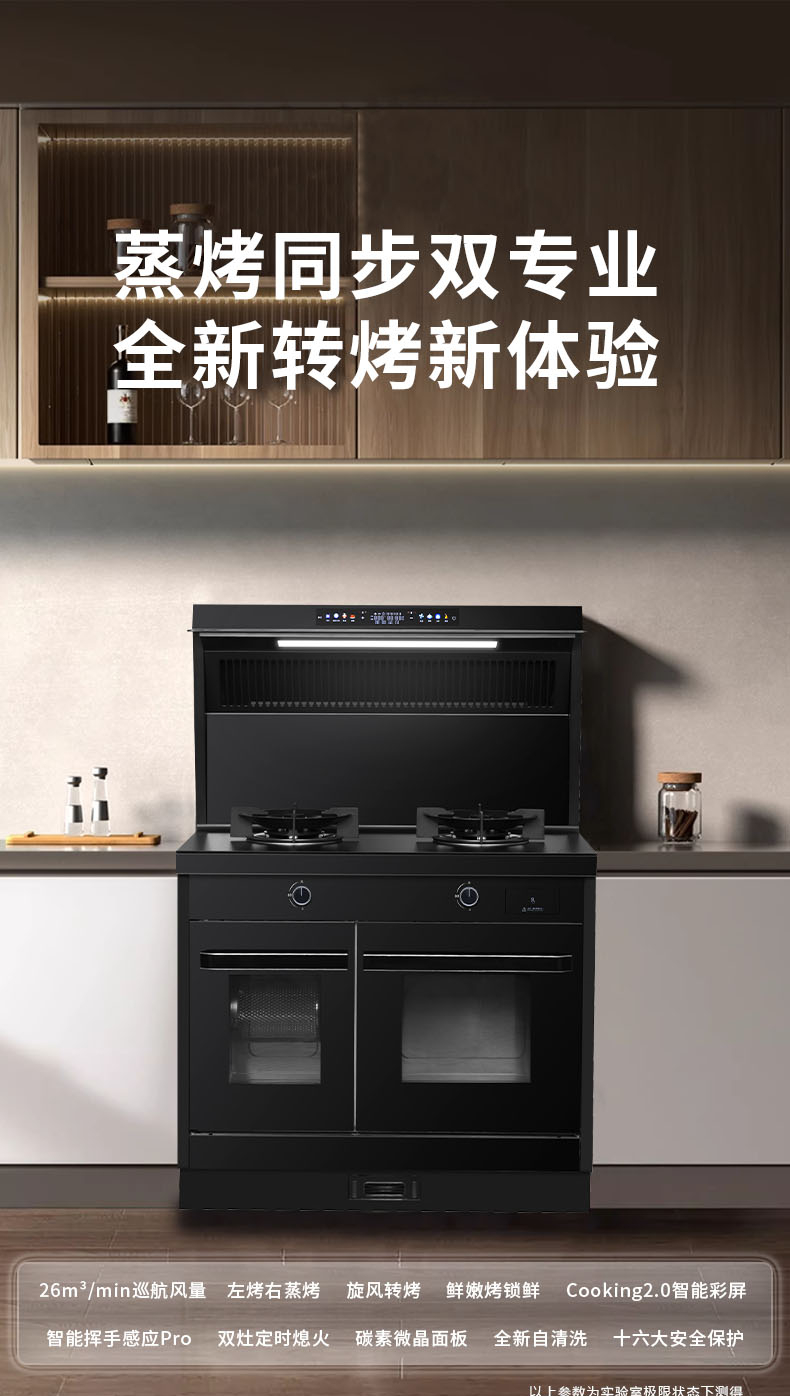26m3每分巡航風量,左烤右蒸烤,旋風轉烤,智能彩屏,揮手感應,雙灶定時熄火